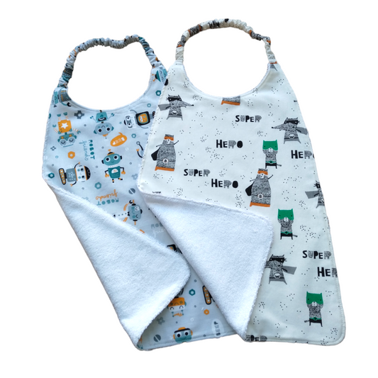 Découvrez notre lot de 2 serviettes bavoir réutilisables, idéales pour accompagner votre enfant au quotidien !