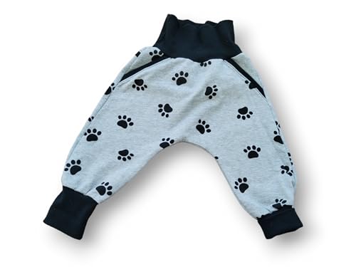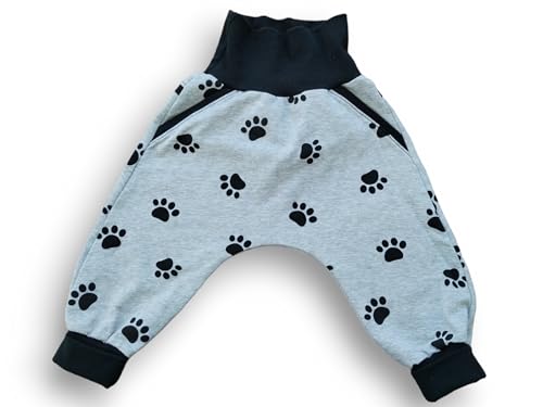 Sarouel évolutif confectionné dans un tissu sweat molletonné gris avec motifs.